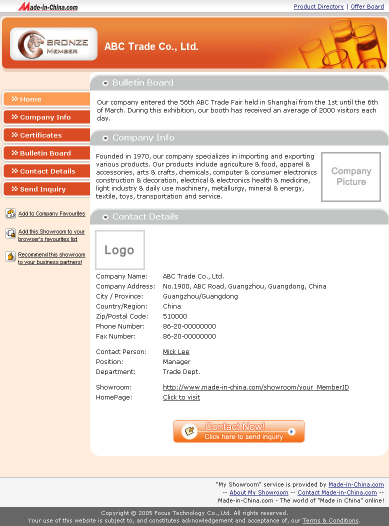 在"我的展示厅"中,公司介绍、产品信息、联系方法等可以在统一、协调的独立网页中进行展示。展示厅内的所有信息都会得到3V资源网专业编辑的审核,确保信息齐全,页面美观。